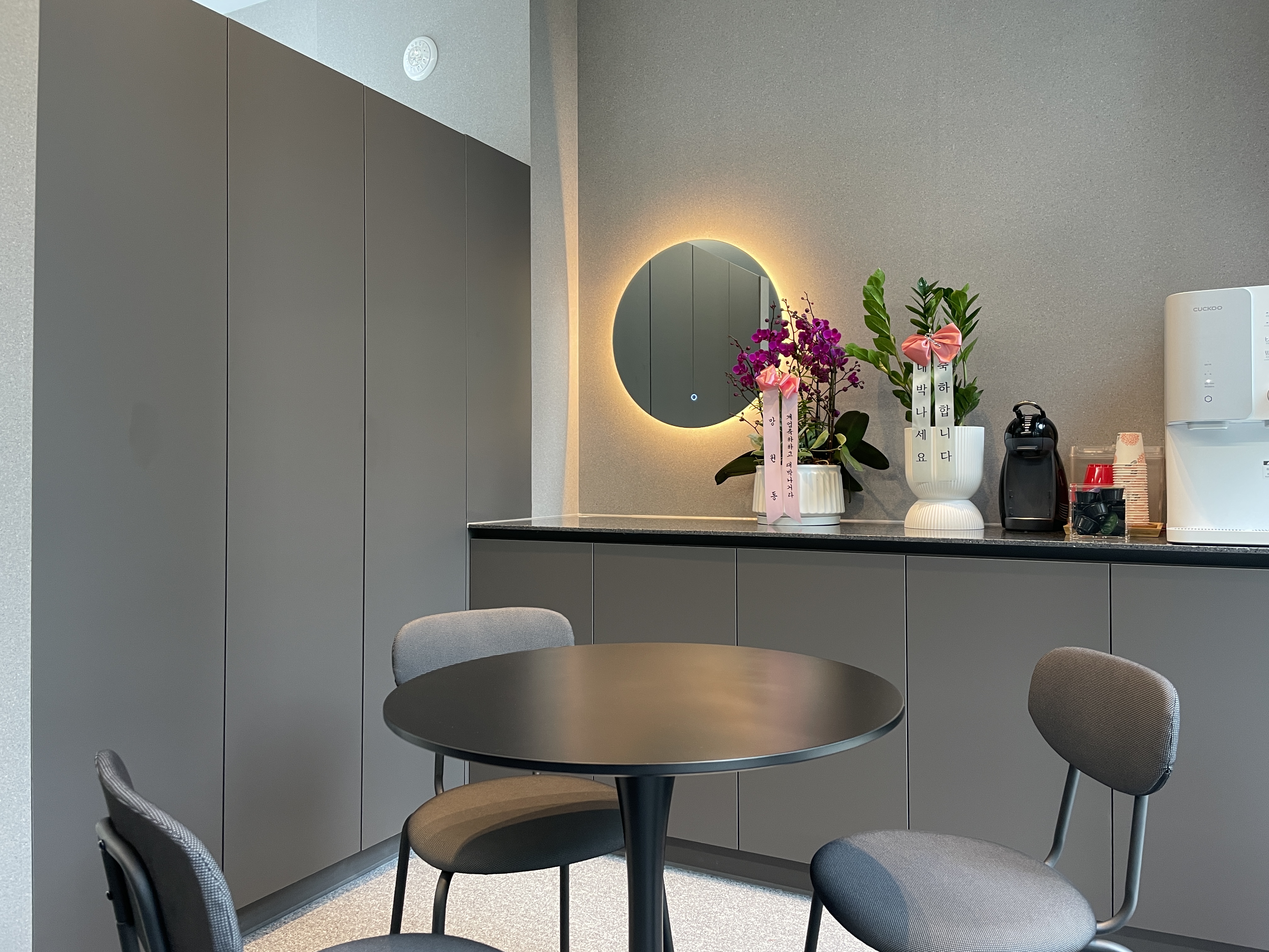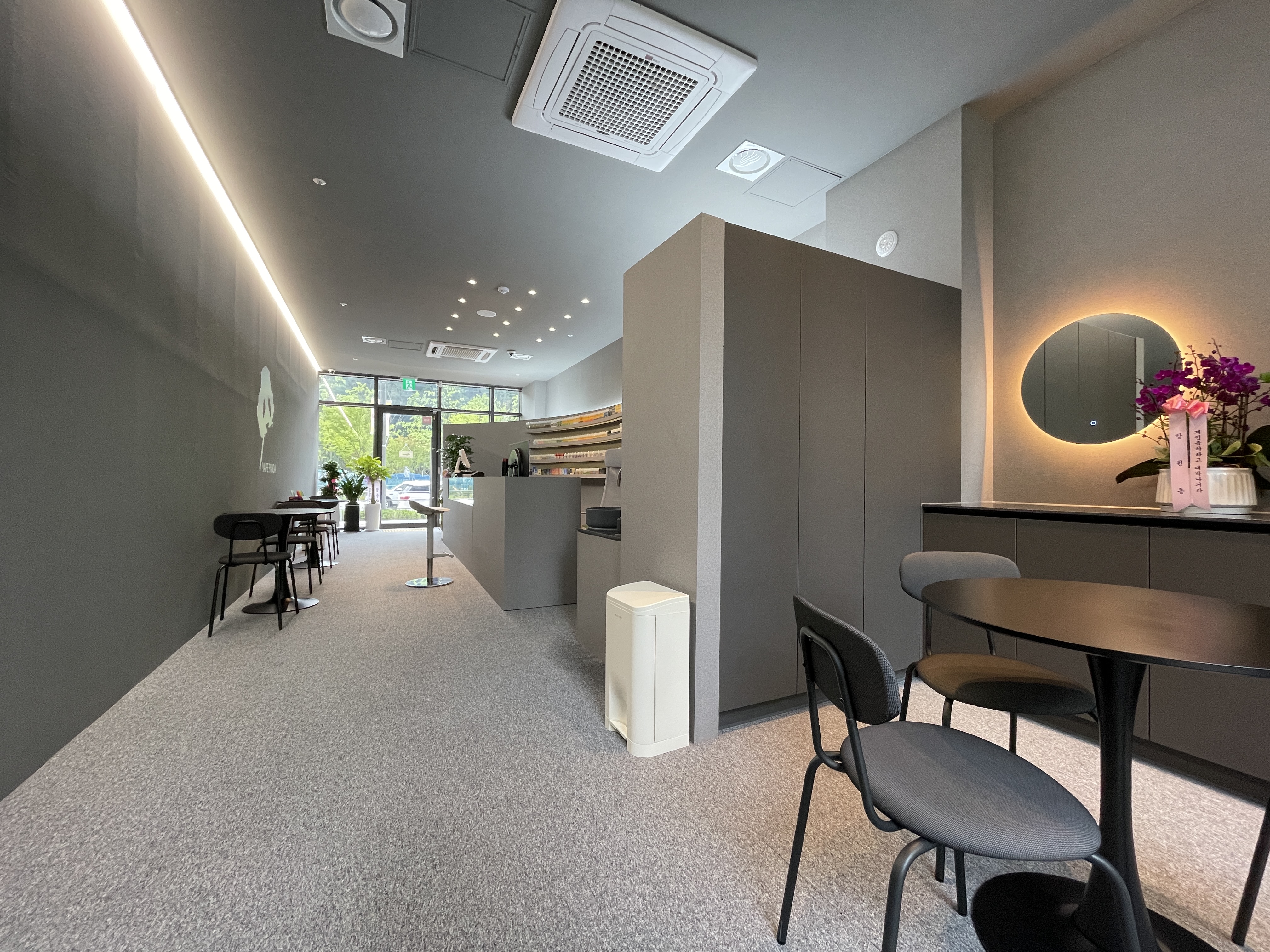 액상 시연을 위한 바체어를 비롯해 대기 및 셀프 시연을 위한 테이블과 의자가 마련되어 있습니다.